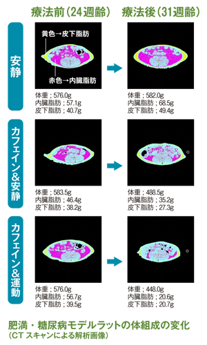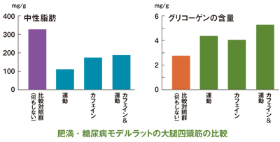「カフェインを与えて運動させたラットは、内臓脂肪の減少が顕著でした。筋肉の量もほかのラットに比べて多くなったので、メタボリック症候群の予防や改善には有効だと考えています」